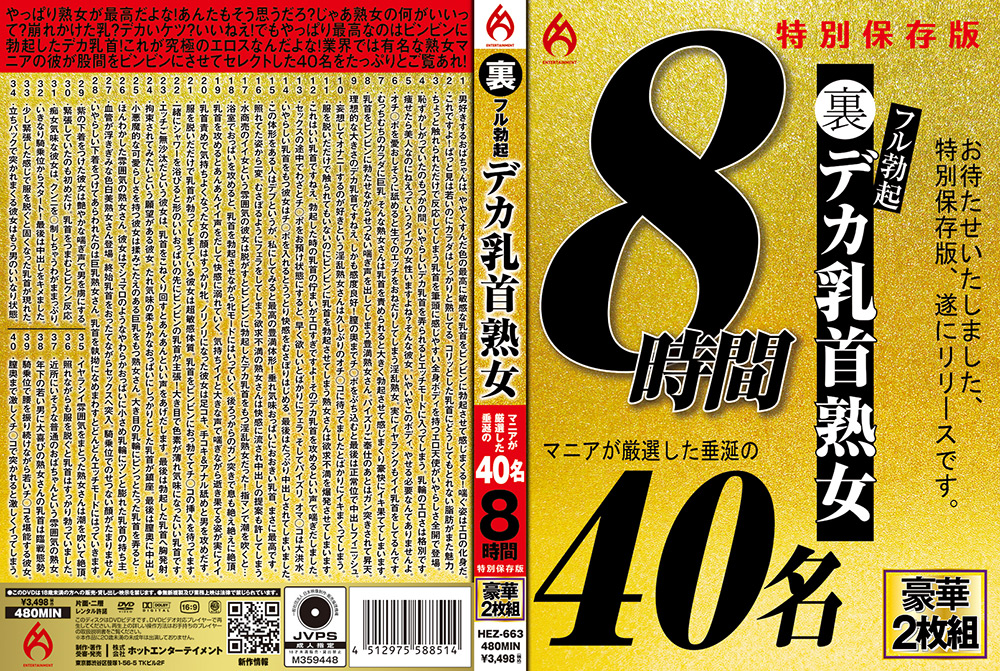 商品紹介文: やっぱり熟女が最高だよな!あんたもそう思うだろ?じゃあ熟女の何がいいって?崩れかけた乳?デカいケツ?いいねえ!でもやっぱり最高なのはビンビンに勃起したデカ乳首!これが究極のエロスなんだよな!業界では有名な熟女マニアの彼が股間をビンビンにさせてセレクトした40名!8時間の特別保存版です!